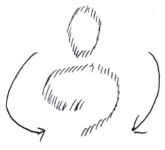 B als gebaar ontstaat door te doen alsof je iemand omarmt en een arm om diens bovenrug en een op de onderrug legt. Het gevoel te hebben met een grote zwaai een grote cape om diegene heen te leggen helpt.