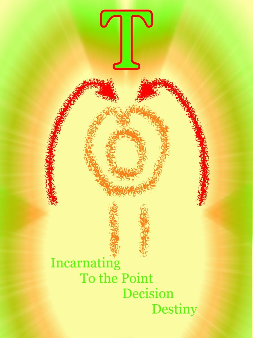T is landen/aankomen, bevestigen, besluit. Alsof met een hamerslag bevestigt wordt, zo is het en niet anders. Alsof de Goden met een blikseminslag hun besluit laten weten. Daarom komt T ook vaan aan het einde van een woord. (hier een D die klinkt als een T)